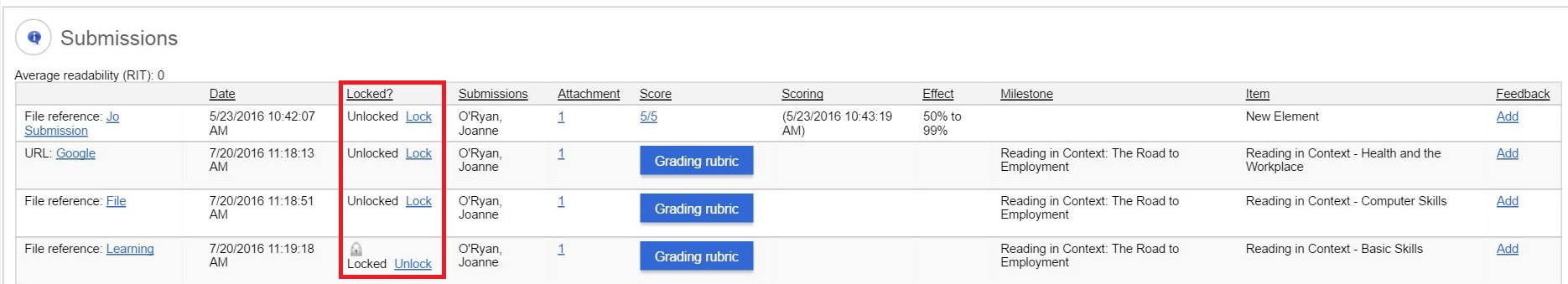 This article will review unlocking and locking submissions. The article will review steps on locking/unlocking submissions and student's view of each action.